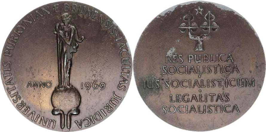 Medaile k obnovení Právnické fakulty J.E. Purkyně r. 1969, symbol fakulty a latinský opis / Styliz. lipový strom a 5ti řádk. latin. nápis hnědě patin. kov 60 mm 56,16 g