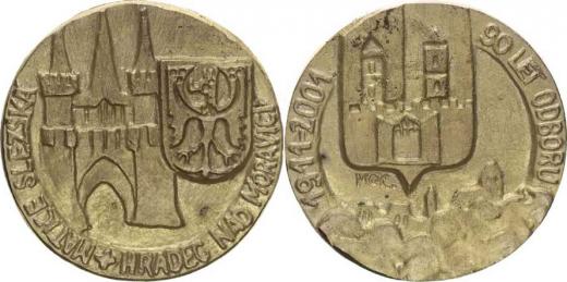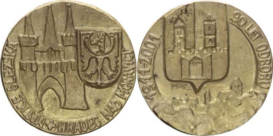 Matice slezská, Av. hradební brána, napravo slezská orlice / Nad panoram. městský znak, opis: 90 let odboru 1911 - 2001 sign. KO C litá mosaz 70 mm 180 g na hraně číslo 50 etue Javor. -,