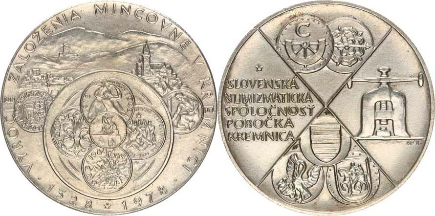 650 rokov založenia mincovny 1328-1978, Pohled na město, mince, o pis / Balanciér, znaky, nápis: Slovenská numizmatická spoločnosť pobočka Kremnica sign.: AP´78 (Andrej Peter) postř. bronz 50 mm