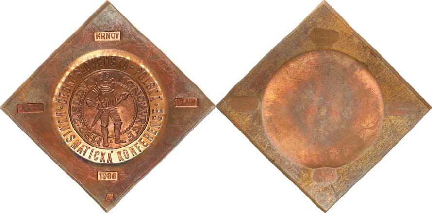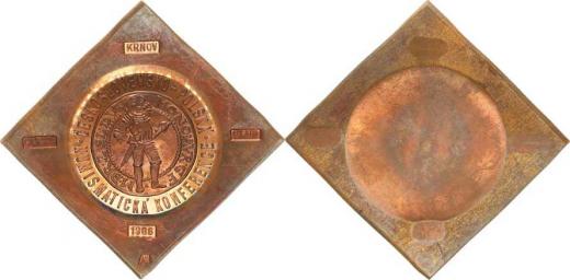 Československo-polská numismatická konference 1986 sign.: JČ vyd. ČNS pob. Medaile Brno BK 6/12 Cu klipa 42x42 mm _patina