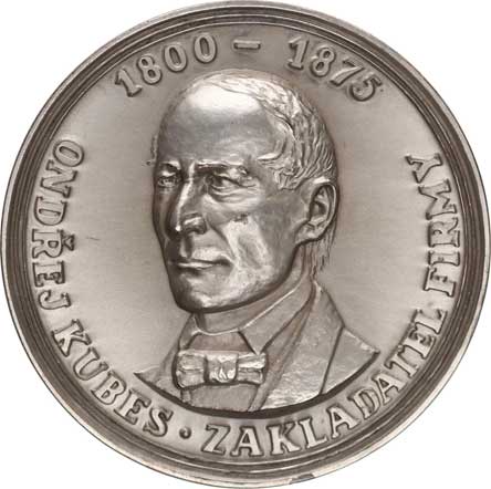Kubes Ondřej 1800 - 1875, zakladatel firmy, portrét mírně vlevo, opis / Vznášející se Merkur na oblacích, alegorie, na pozadí vedu ta města Kroměříže, nápis: A. KUBES / PRVNÍ KROMĚŘÍŽSKÝ / ZÁVOD ŽELEZÁŘSKÝ 1821 - 1946 postř. bronz 60 mm 73,95 g orig. etue +firemní věnování na oslavu 125-letého trvání fy.
