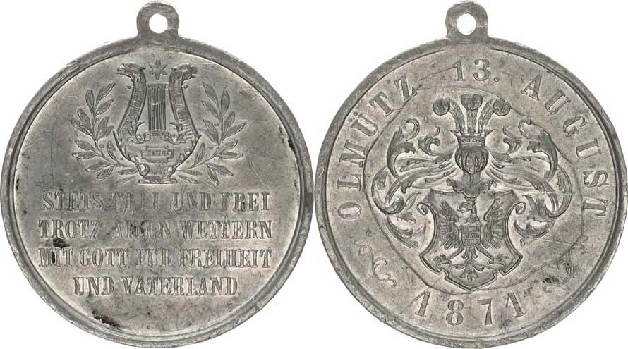 Zpěvácký spolek v Olomouci, městská orlice s fafrnochy pod hledím , opis OLMÜTZ 13. AUGUST 1871 / Lyra a nápis o 4 řádcích Sn 31 mm pův. závěs Taul 458
