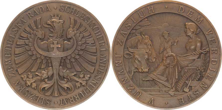 Slezská zemědělská rada, orlice / "V uzunání zásluh", alegorie česko-německé opisy bronz 52 mm 54,7 g Javor. II.2