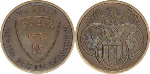 V. sjezd numismatiků Slezské oblasti 1960 / V kruhu slezská orlic e překryta třemi slezskými mincemi sign: H. ŠLOSAR vydala ČNS pob. Opava bronz 31 mm (100 ks)Javorský I. 4; BK 29/5