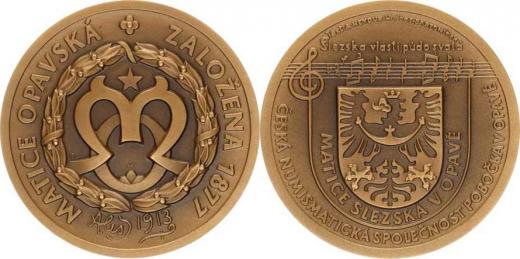 120 let Matice slezské v Opavě 1877-1997 / Erb se slezskou orlicí , nad ní v notové osnově prvé takty slezské hymny vydala ČNS po b. v Opavě sign.: MP (M.Poldaufová) bronz 60 mm (150 ks)Javor. I.21/ strana 141 orig. etue