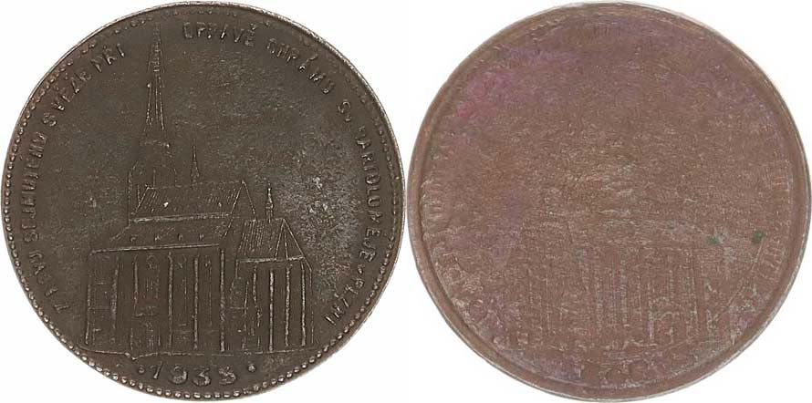 Z kovu sejmutého z věže při opravě chrámu sv. Bartoloměje v Plzni 1935. Pohled na chrám, opis Cu 32,5 mm "R"