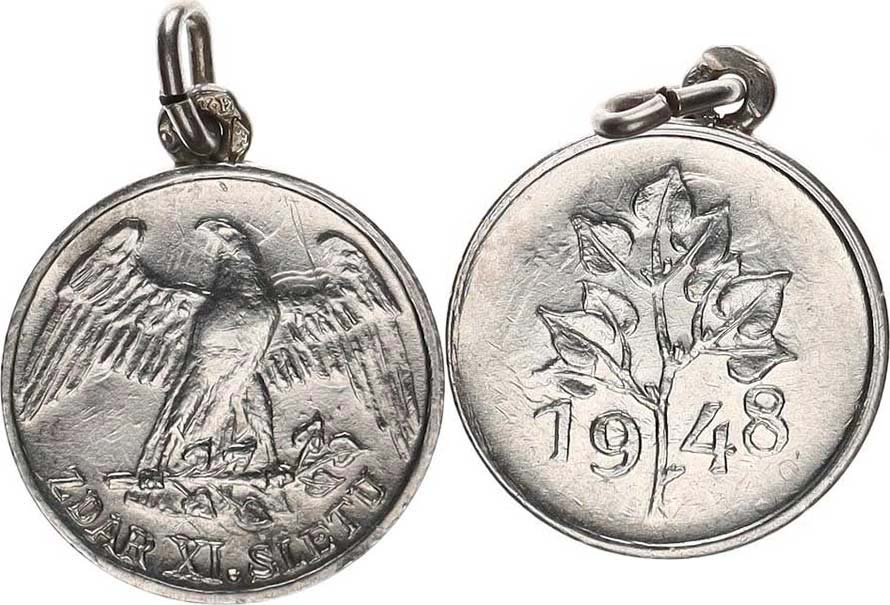 "Zdar XI. Sletu", sokol s rozepjatými křídly / lipová ratolest a datace 1948 Ag 16 mm 2,39 g Nov. XI 37a orig. raž. ouško +závěs