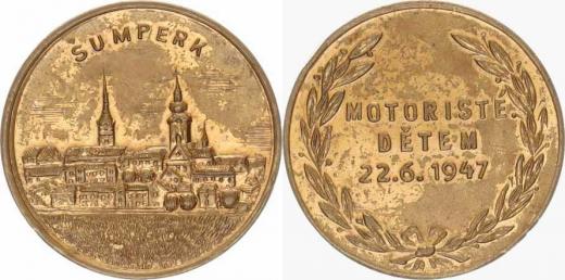 Motoristé dětem 27.6.1948, tří řádk.nápis v otevřené věnci / pohl ed na město Cu 30 mm_lak.