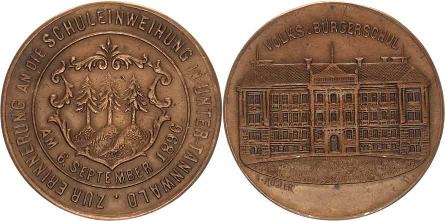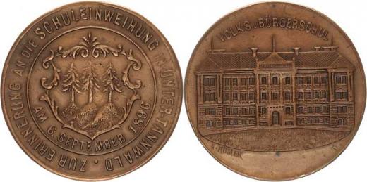 Na památku školních slavností 6.9. 1896, Městský znak a němec. op is / Budova školy, opis: VOLKS u. BÜRGERSCHUL sign.: A. Rösler Cu 32 mm 13,04 g "RR"