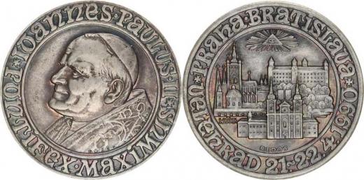Pamětní medaile na návštěvu papeže Jana Pavla II. v Praze, na Vel radě a Bratislavě r. 1990, Poprsí papeže zleva, opis / Pod Božím okem jsou vzájemně se překrývající pohledy na chrám sv. Víta, bratislavský hrad a velehradskou baziliku, opis sign.: Růžek-Zobek-Novotný patin. postř. bronz 40 mm Burian 209