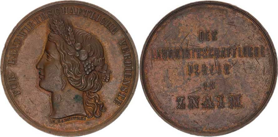 Zemědělská společnost ve Znojmě, 5ti řádkový nápis / Hlava dívky zleva s věncem s obilních klasů ve vlasech, opis: F'ÜR LANDWIRTHS CHAFTLICHE VERDIENSTE sign.: C. Radnitzki bronz 40,4 mm 33,60 g "RR"_dr. rys.