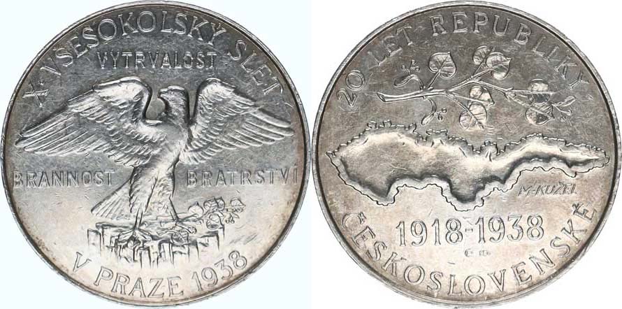 X. Všesokolský slet 1938, sedící sokol / 20. výročí republiky, mapa republiky a lipová ratolest Ag 987/1000 35 mm 1 3,417 g (2x punc)