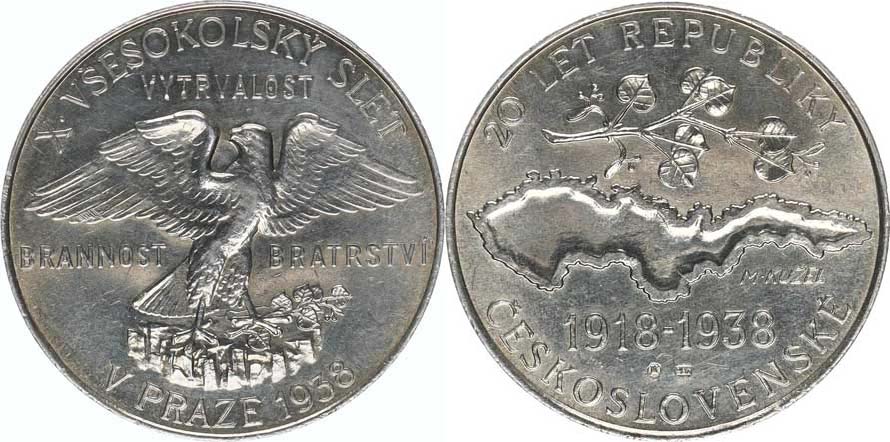 X. všesokolský slet 1938, sedící sokol / 20. výročí republiky, mapa republiky a lipová ratolest Ag 987/1000 35 mm 1 3,305 g