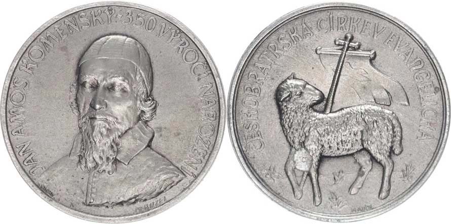 Jan Amos Komenský 350. výročí narození (1942), A: Poprsí mírně zl ea, opis / Česko-bratrská církev evangelická, beránek, opis ražebna: Pichl Zn 40 mm 25,80 g "R"