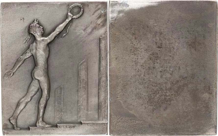 Medaile s atletem, Kráčejíci atlet po schodišti s vavřín. věncem před třemi antickými sloupy postř. plaketa 50x64 mm