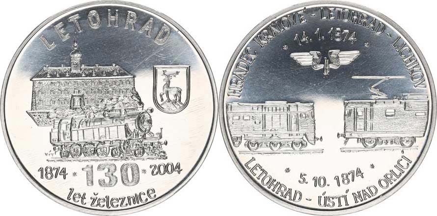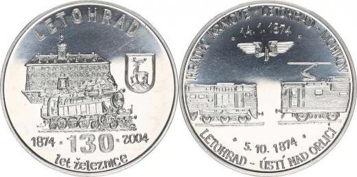 130 let železnice Letohrad - Ústí nad Orlicí 1874 - 2004, pohled na zámek, lokomotiva, erb, opis / dvě lokomotivay proti sobě, opi s Al 42 mm kapsle
