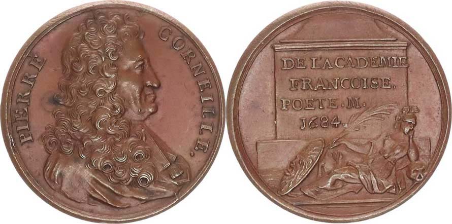 Pierre Corneille, busta zprava, opis / pomník s ležící postavou a nápisy Cu 29 mm (tato bronzová medaile je jednou ze 74 v Ga lerii Métallique des Grand Hommes du siecle de Louis XIV. od Jeana Dassiera vydané v roce 1723-1724)