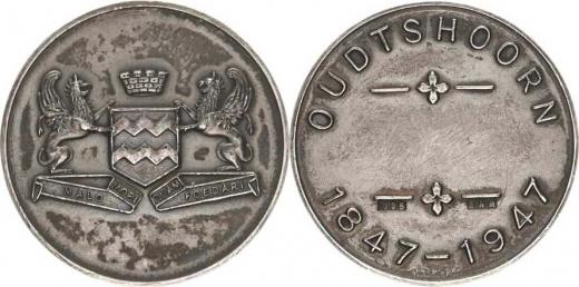George VI. - 100. výročí města Oudtshoorn, po stranách korunované ho erbu Pegasové, ve stuze nápis MALO-MORI-QUAM-FOEDARI / nápis: OUDTSHOORN - 1847-1947 Ag punc 925 31,5 mm 18,249 gAM2 275; Laidlaw 0605; N 403601