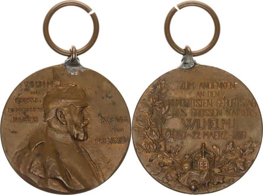 Wilhelm I., poprsí zprava v přilbici, nápisy / Na památku 100. vý r. narození 1797-1897, korunovační klenoty na dubovo-vavřín. větv ička, 6-ti řádk. nápis bronz 40 mm pův. ouško +závěs
