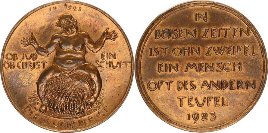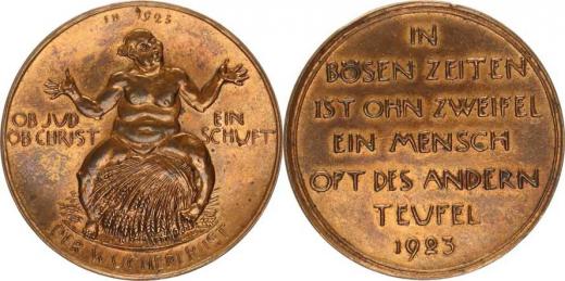 Medaile na drahotu 1923 - "Ob Jud, Ob Christ - ein Schuft der Wuc herer ist", na svazku obilí sedí gestikulující starší tlustý muž / 7-mi řádkový německý nápis bronz 38 mm