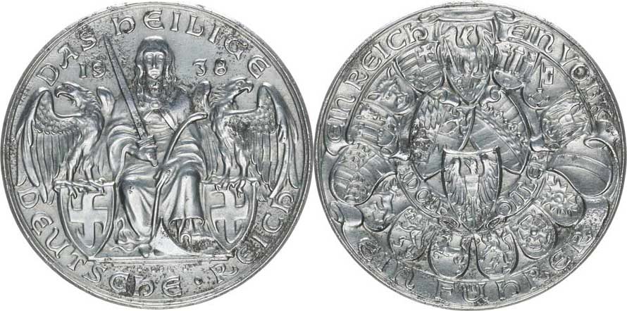 "Das Heilige Deutsche Reich 1938", Germania mezi dvěma orly se št íty s hákovým křížem / Erby německých zemí včetně Rakouska, nápis Ein Reich, Ein Volk, Ein Führer sign.: K. GOEZ na hraně: Bayyer. Hauptmünzamt bílý kov 36 mm 19,35 g_nep. koroze
