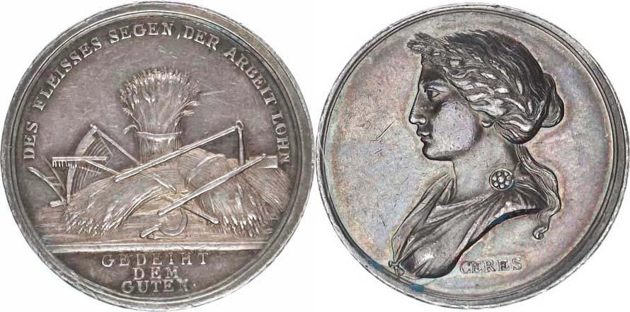 Medaile b.l., "Odměna za práci v zemědělství", alegorie, opis a 3 řádk. nápis / busta bohyně Ceres zleva Ag 32 mm 9,4 g