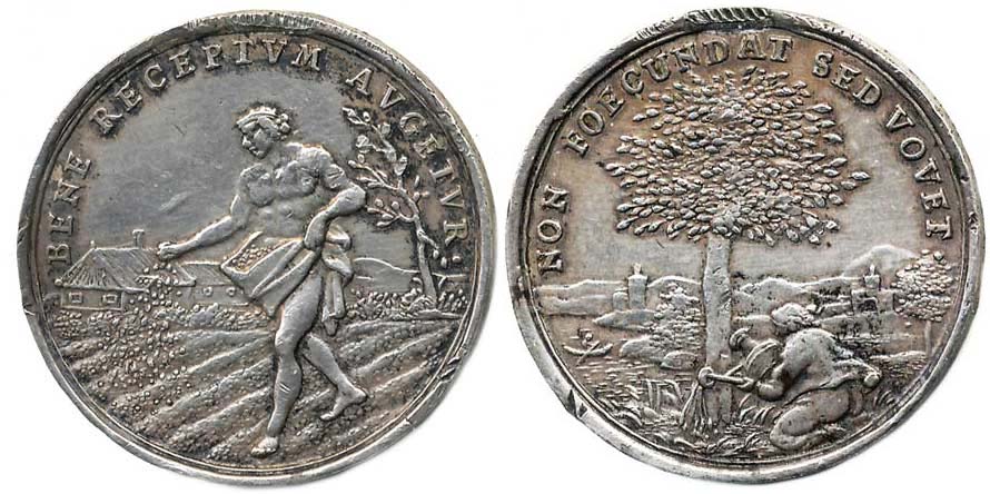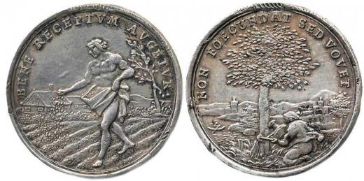 Norimberk - Mravoučná medaile (17. stol.), A: Nahý rozsévač, v po zadí statek BENE RECEPTVM AVGE TVR / R: zahradník zalévá strom, v pozadí krajina NON POECUNDAT SED VOVET Ag 28 mm 5,50 gSlg. Goppel 1060