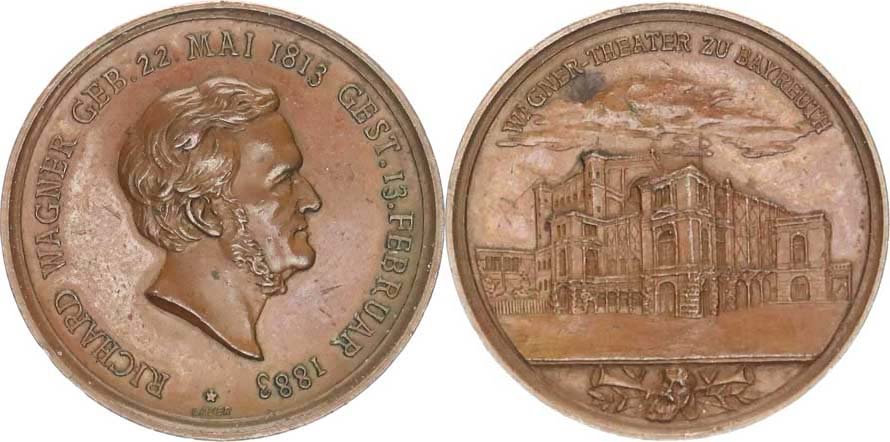 Richard Wagner, hlava vpravo a životopisná data / Festivalový dům v Bayreuthu, opis sign.: LAUER Cu 27 mmova