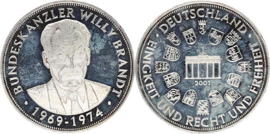 Willy Brandt 1869-1974, Bundeskanzler, portrét čelně / Kolem bran denburské brány spolkové znaky, opis: EINGKEIT UND.... 2001 Ag 40 mm 20,186 g