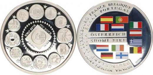 "Evropské peníze 2002", uprostřed 1 Euro mince, po obvodu 12 minc í evropských zemí / v symbolu Eura "E" dvojitý opis, uprostřed 12 barevných vlajek Ag 999,9 35 mm 20 g certifikát Nr. S/35 0339_poškozená etue