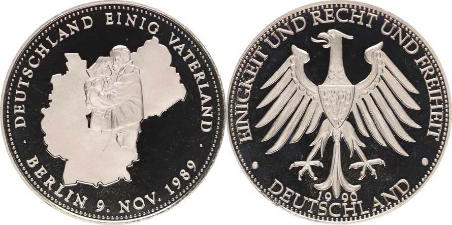 Berlin, Sjednocení Německa 9.11. 1989. Av.: Mapa a objímající se postavy opis / Orlice, opis a datace 1990 bílý kov 40 mm kap sle