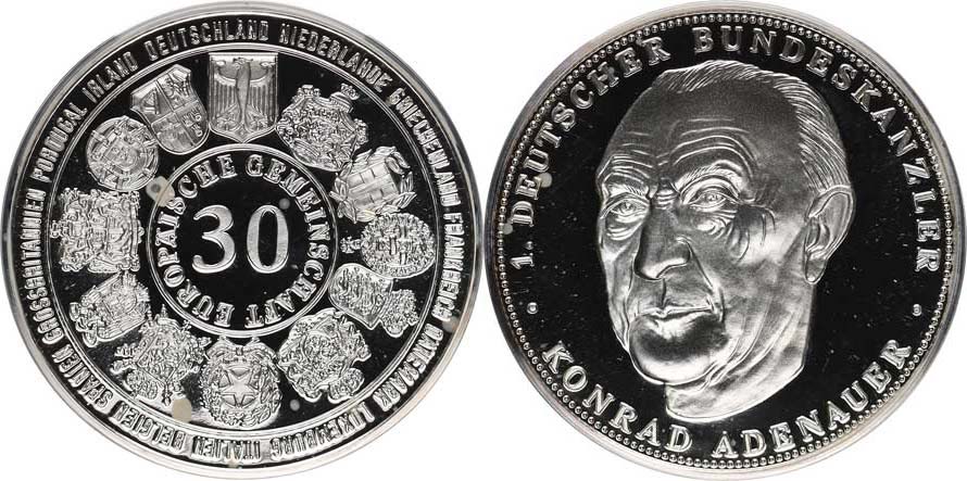30. výročí evropského společenství, Av: ve vnitřním kruhu 12 erbů , kolem opis, uprostřed číslice "30" / Konrad Adenauer - 1. němec ký Spolkový prezident, hlava mírně zleva, opis Ag 999 20 g40 mm kapsle