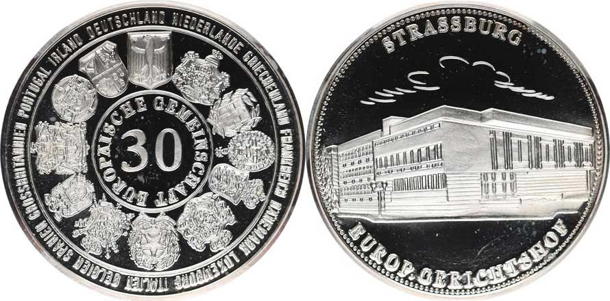 30. výročí evropského společenství, Av: ve vnitřním kruhu 12 erbů , kolem opis, uprostřed číslice "30" / Strassburg - soudní dvůr, opis Ag 999 20 g 40 mm kapsle