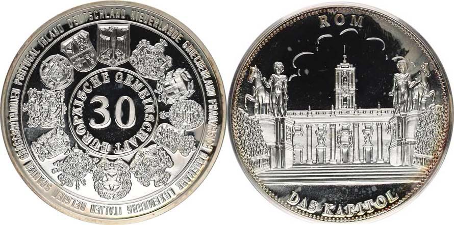 30. výročí evropského společenství, Av: ve vnitřním kruhu 12 erbů , kolem opis, uprostřed číslice "30" / Kapitol v Římě, budova, op is Ag 999 20 g 40 mm kapsle