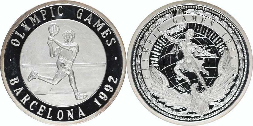 Olympijké hry Barcelona 1992, Tenista / Antický běžec s pochodní na křídlech orla, v pozadí zeměkoule s blesky Ag 999 40 mm 2 0 g kapsle