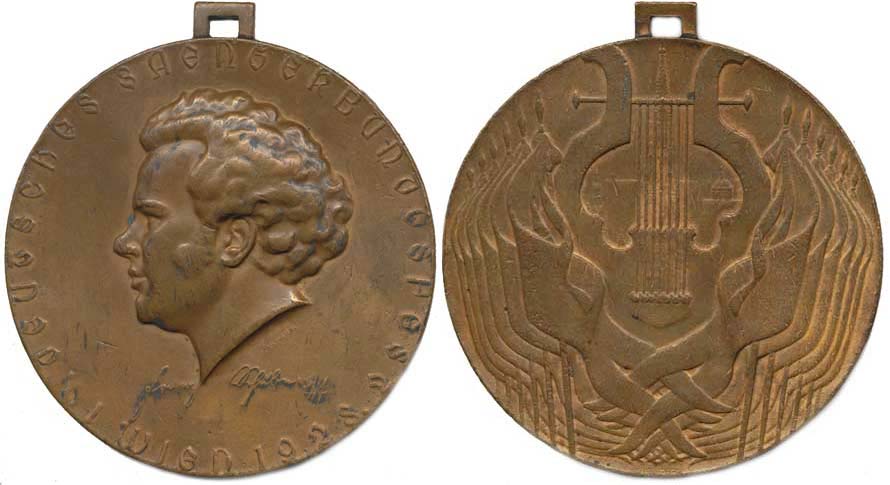 Vídeň - 10. Deutsches Sängerbundesfest Wien 1928. Av.: Portrét Fr anze Schuberta zleva, opis / Styliz. pohled na Vídeň skrz Lyru, p o stranách vlajky sign.: Karl Perl, na hraně: H. GNAD WIEN VII bronz 90 mm s hranatým ouškem cca 238 g "RR"