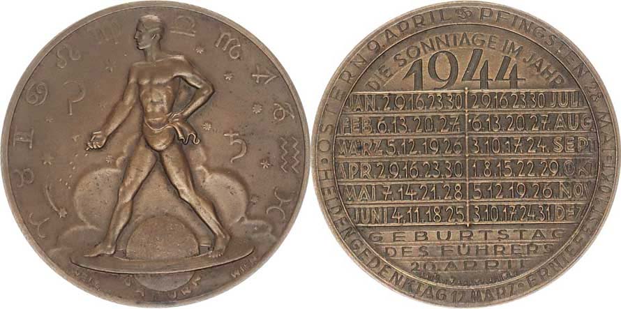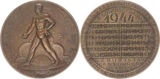 Vídeň - kalendářní medaile na rok 1944 - Saturn, kráčející postav a na prstenci Saturnu sign.: WELZ (minc. Wien) bronz 40 m m 21,60 g