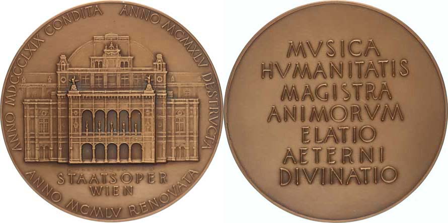 Vídeň - Státní opera, roku 1869 založena - roku 1945 zničena - ro ku 1955 obnovena Av: budova divadla, opis / 7mi řádk. latinský ná pis: MVSICA/HVMANITATIS..... sign.: KOTTENSTORFER na hraně MÜNZE WIEN bronz 60 mm 74,65 g
