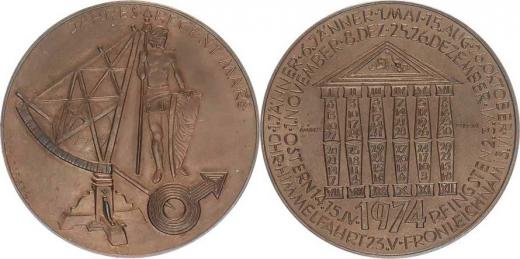 Vídeň - kalendářní medaile na rok 1974 - Stojící Mars drží štít a kopí, vlevo sextant sign.: Köttenstorfer bronz 40 mm 22, 10 g (minc. Wien)