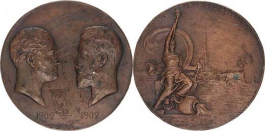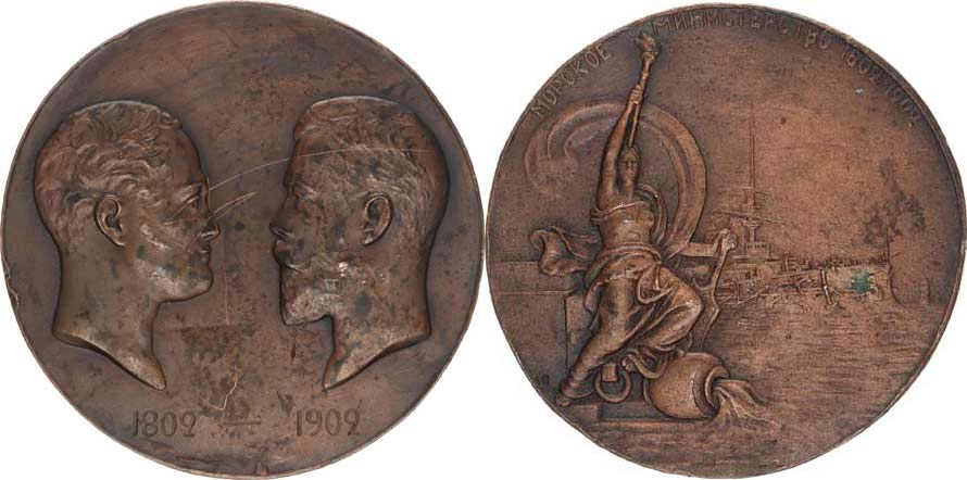 Mikuláš I. a Alexandr I., portréty proti sobě s datací 1802-1902 / Námořní ministerstvo 1802-1902, žena s pochodní a kormidlem, na pozadí křižník sign.: AB Cu galvano 63 mm 103,10 g