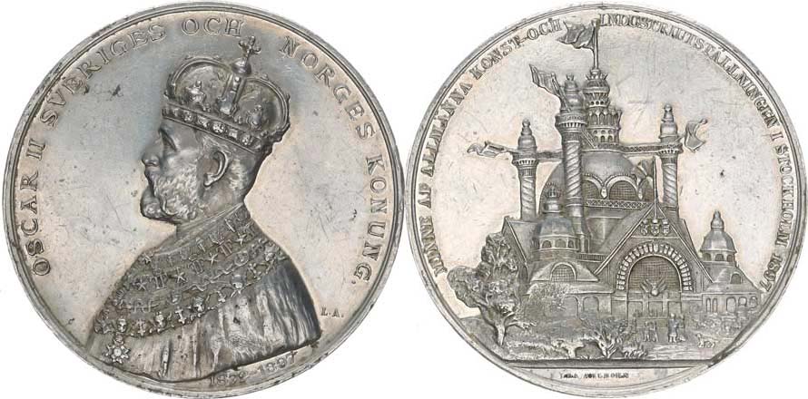 Oscar II. - švédský a norský král 1872-1897, korunovaé poprsí krá le s nejvyššími Řády vlevo, opis / Všeobecná umělecko-průmyslová výstava ve Stockholmu 1897, výstavní pailon, opis sign.: Lea Ahlborn Al 45 mm 10,25 g