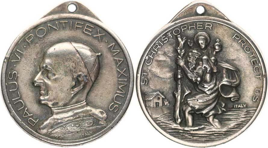 Paulus VI., hlava zleva, opis / sv. Kryštof, ST. CHRISTOPHER PROT ECT US sign.: ITALY bílý kov 35 mm orig. ouško