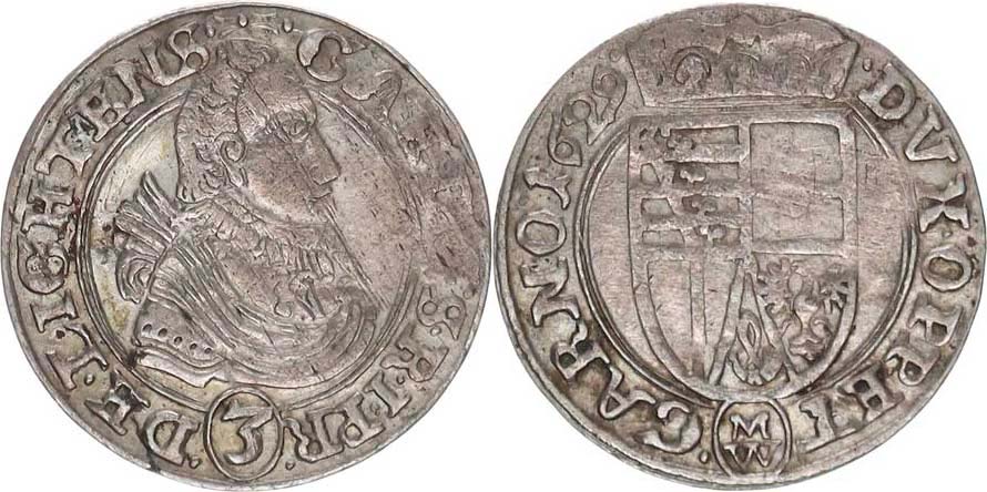 3 kr. 1629 MW SA - , jako 41 ale minc.zn. pod erbem / nominá l pod poprsím "R"_mír. nedor., tém.