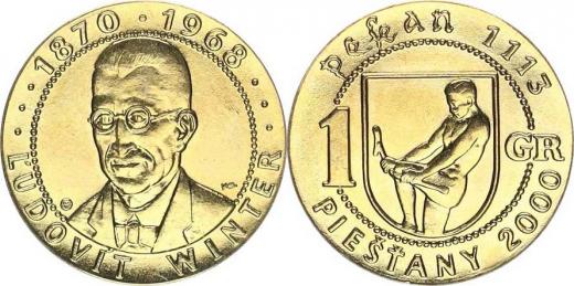 Piešťany - 1 gr. Pekan 1113, erb města, Piešťany 2000 / Ľudovít W inter 1870-1963, poprsí mírně zleva zůacený bronz 25 mm kapsle