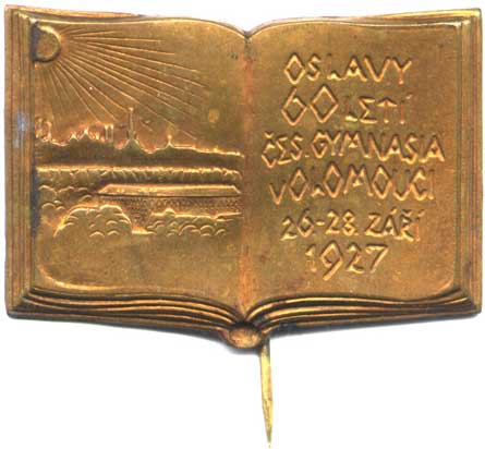 Olomouc - Oslavy 60ti letí čes. gymnasia v Olomouci 26.-28. září 1927, rozevřená kniha, vlevo panoráma města, vpravo nápisy bronz. plech 46x32 mm jehlice