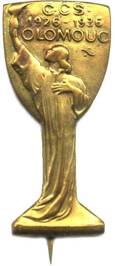Olomouc - "C. ČS. / 1926-1936 / OLOMOUC - k 10. výr. dostavby Hus ova sboru mosaz. plech 19x40 mm jehlice