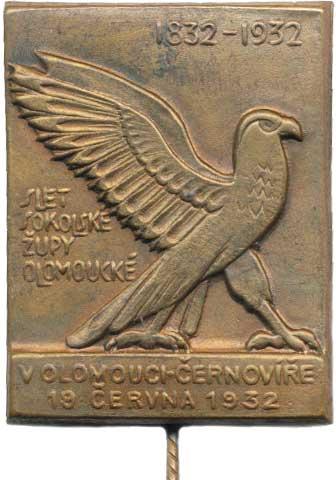 Olomouc - Slet sokolské župy olomoucké v Olomouci - Černovíře 19. června 1932 bronz. plech 28x36 mm jehlice