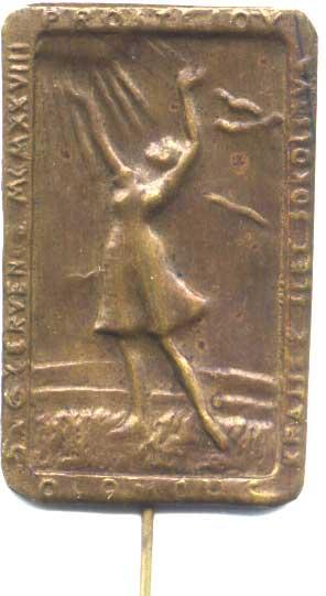 Olomouc - Krajský slet sokolstva Prostějov - Olomouc 5. a 6. červ ence MCMXXVIII mosaz. plech 24x38 mm jehlice