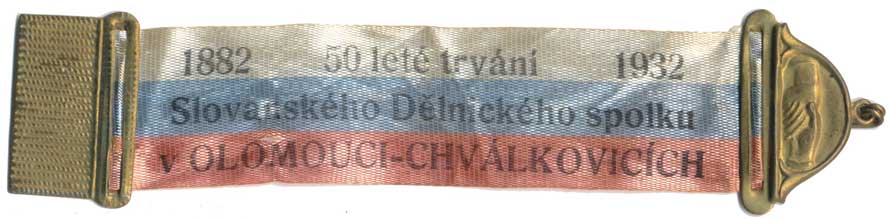 Olomouc - 50leté trvání Dělnického spolku v Olomouci-Chválkovicíc h 1882-1932 trikolor. stuha 21mm se zlacenýni konci zn.: KARN ET KYSELÝ