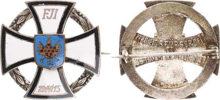 Odznak - "Kriegsfürsorge der Stadt M. Trübau 1914 / 15" (M.Třebov á), na dubovém věnci bílo-černý smalt. tlapatý kříž, uprostřed v modrém štítku městský znak, v horním poli kříže iniciály F.J.I.,ve spodním datace 1914/15 30x30 mm zapínací sponka